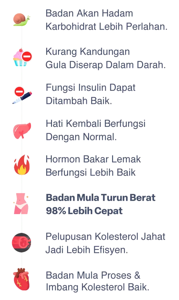 BIOKENAF® target baiki proses metabolisma badan dengan merawat pencernaan karbohidrat, perlahankan serapan gula ke dalam darah. Jadikan fungsi insulin dan hati lebih baik, aktifkan hormon pembakar lemak secara berterusan. Hasilnya, usaha untuk anda buang lemak dan turun berat jadi lebih mudah, cepat dan kekal.